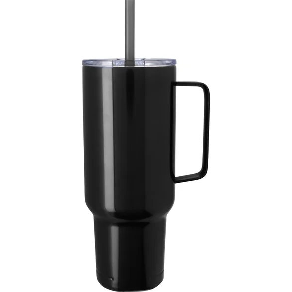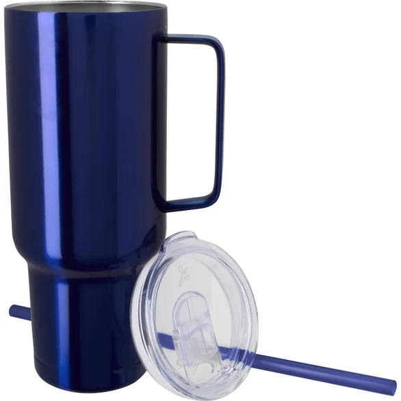 Built with double-wall vacuum insulation and crafted from 90% recycled stainless steel, this tumbler is made to handle both hot and cold beverages with ease. The press-fit slider lid, made from 100% recycled plastic, pairs with a matching straw for convenient sipping, while the large comfort handle makes carrying effortless. A tapered base ensures it fits most standard cup holders despite its generous size.