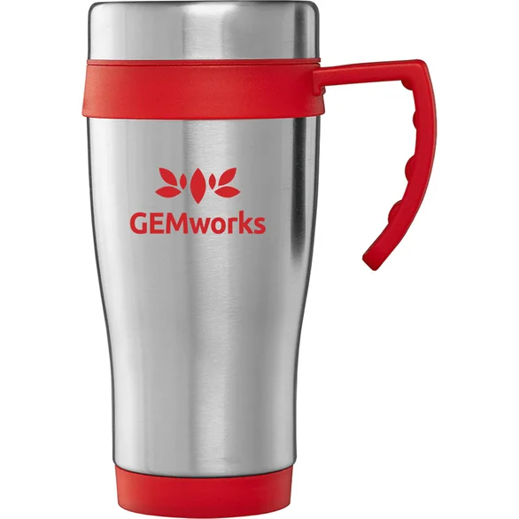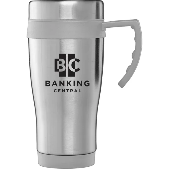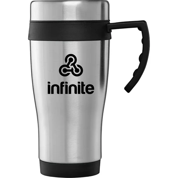 Crafted with a sturdy stainless steel exterior, this travel mug is built to handle daily use while maintaining a comfortable grip. The plastic interior, handle, and trim—available in multiple color options—add convenience and visual contrast, while the built-in handle makes carrying and sipping easy during commutes or travel.